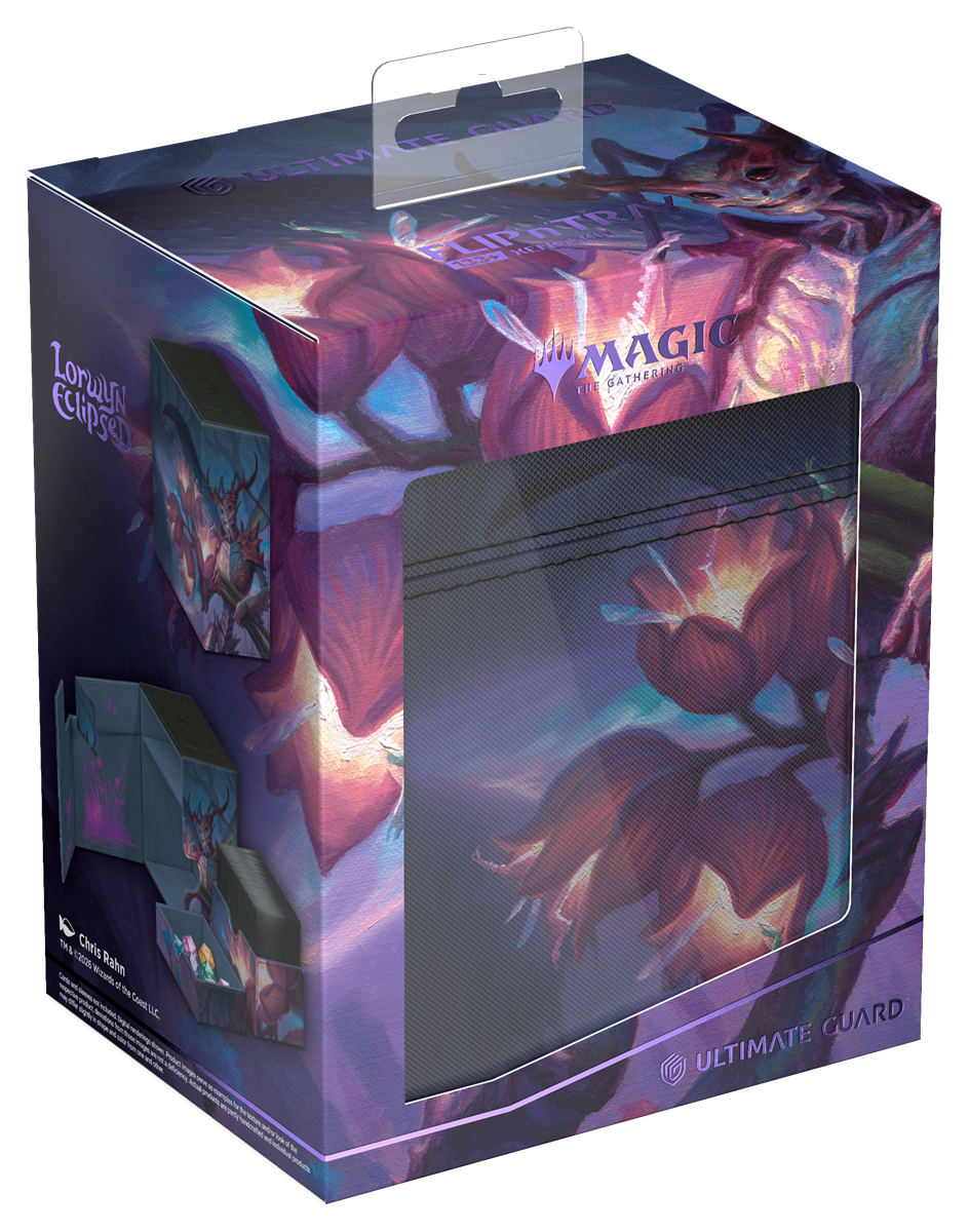 The Flip'n'Tray 133+ Xenoskin is a high-quality TCG deck box that offers premium card protection thanks to its resistant Xenoskin material, microfiber inner lining, and strong magnetic closure. The deck box has an integrated and removable accessory tray for dice that can be accessed independently and is printed in full color with officially licensed artworks from Magic: The Gathering’s set "Lorwyn Eclipsed". The Flip’n’Tray 133+ Xenoskin is optimized to hold 133 double-sleeved or 160 single-sleeved cards in Ultimate Guard sleeves.