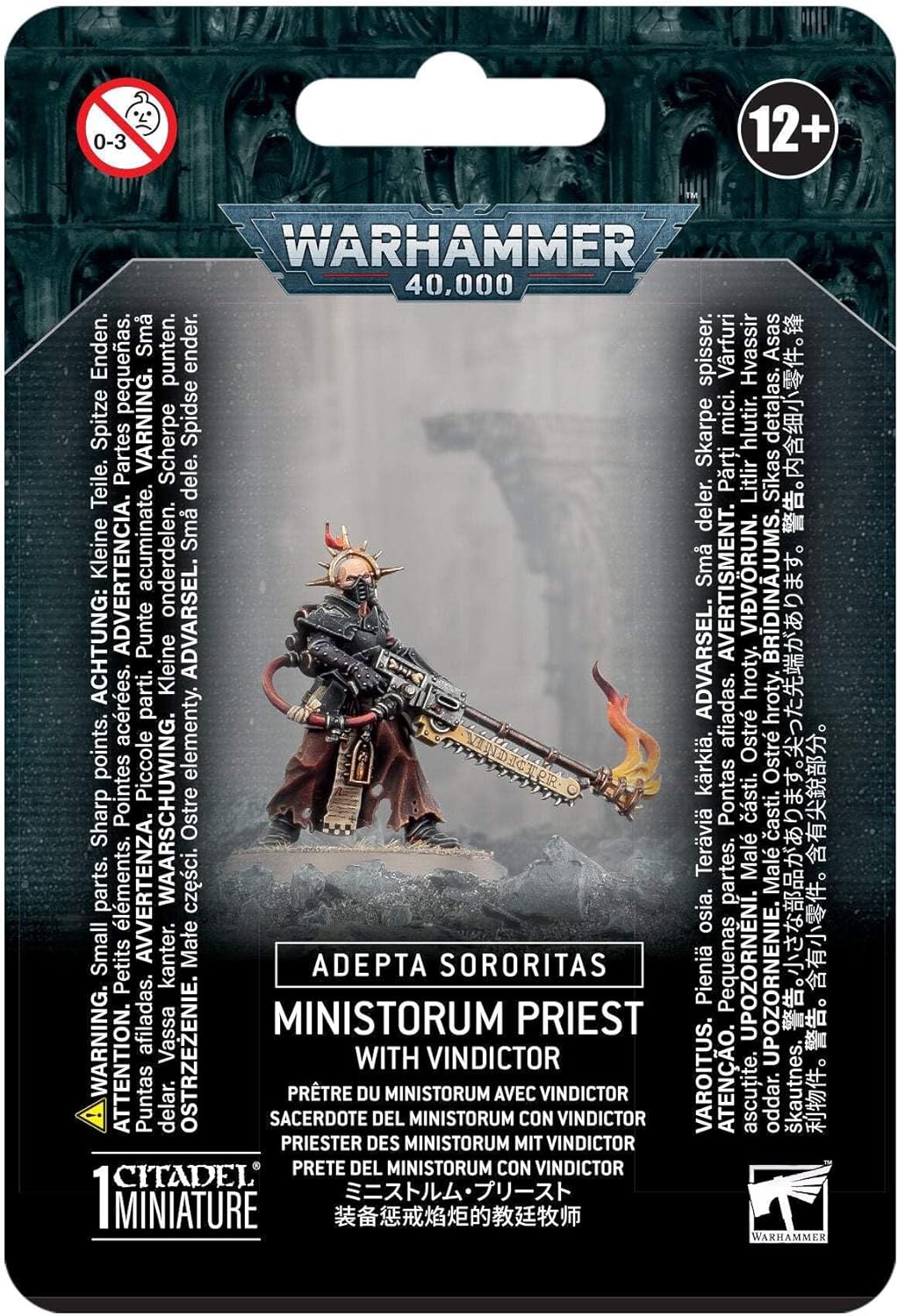 This multipart plastic miniature builds one Ministorum Priest, armed with the utterly deadly vindictor, a combination of a heavy chainsword and flamer. Leading from the front, this powerful support unit empowers nearby Adepta Sororitas units to fight all the harder.